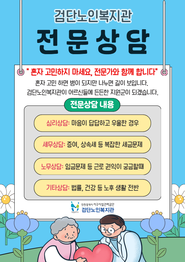 "어르신의 오늘보다 더 나은 내일을 위해, 검단노인복지관 전문상담실의 문은 언제나 활짝 열려 있습니다." 많은 참여바랍니