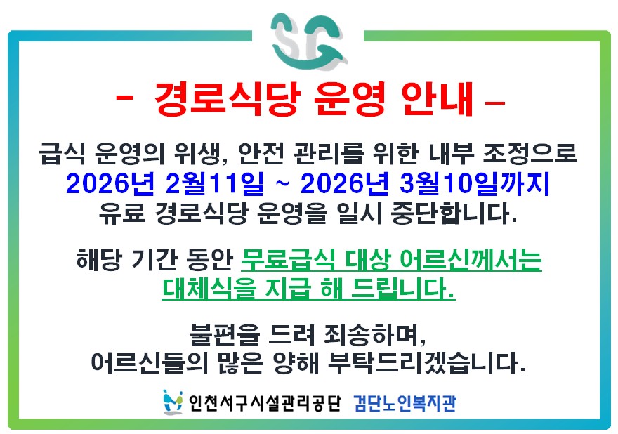 2026년 2월 11일 부터 2026년 3월 9일까지 경로식당 미운영으로 무료급식 대상자에게 대체식 안내